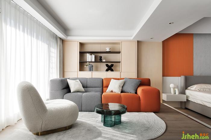 這個封窗后的陽臺空間,現(xiàn)在已經(jīng)是一個套入主臥的休閑區(qū)域。深圳家裝設計沙發(fā)特意選擇了與主臥背景相同的橙色與之相互呼應。