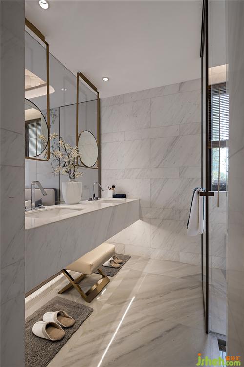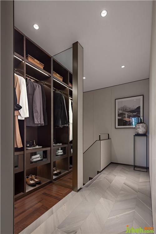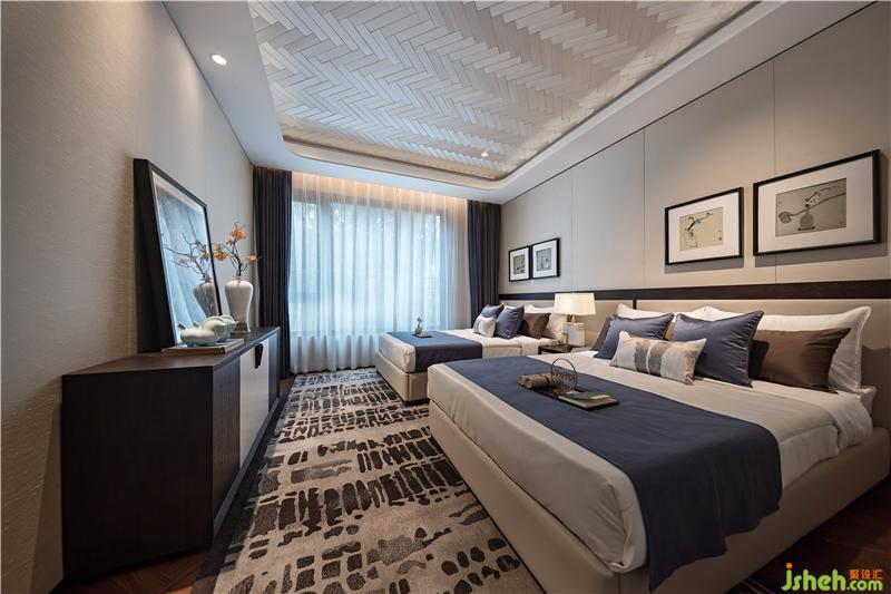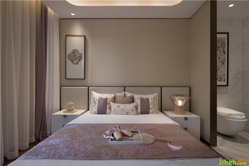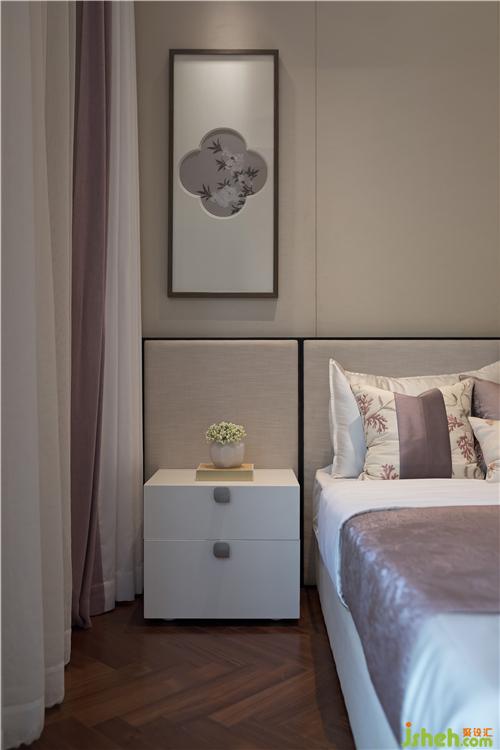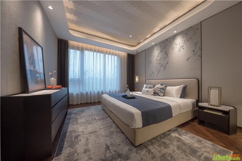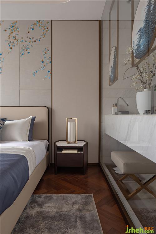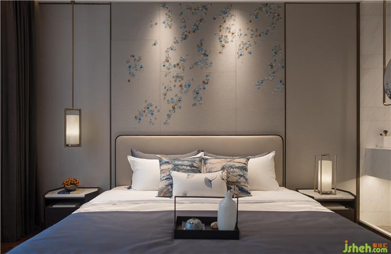 著重于設(shè)計背后所表達的居住體驗,以傳統(tǒng)的湘繡與手繪交織出湖色的空靈。安靜樸雅的色彩搭配,簡潔時尚的金屬線條,貼合居者對生活的需求、對美學(xué)的向往,賦予品位生活細膩的優(yōu)雅。樣板房設(shè)計