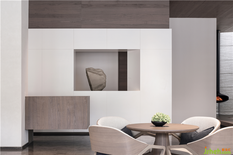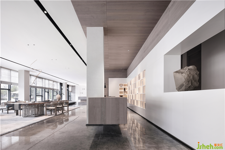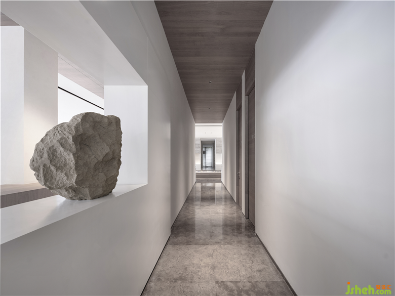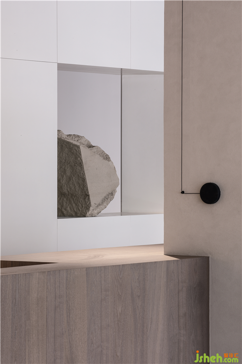 純粹的白色塊面與粗獷的原石雕刻,穿插出一種東方園林屏風的“漏景”韻味。