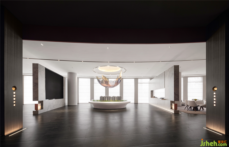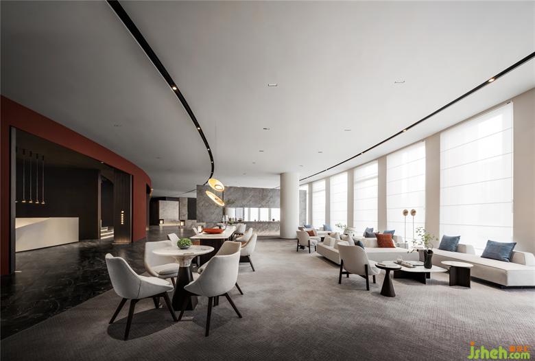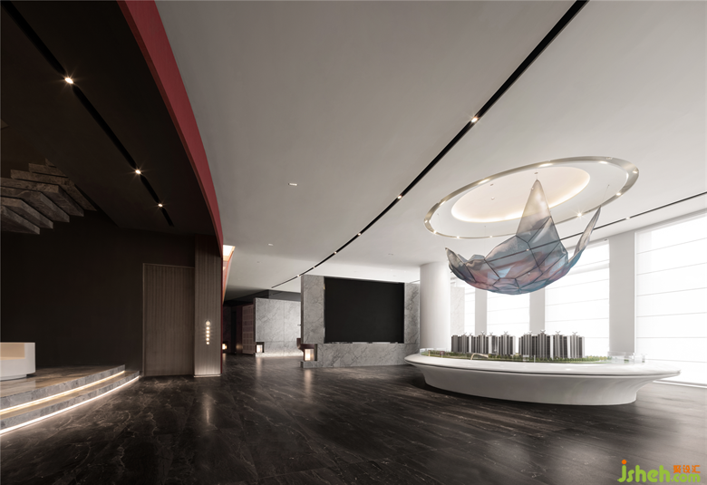 南京售樓處設計曲線落地玻璃幕窗最大化地將室外光景移入室內(nèi),與室內(nèi)光影相映成趣,開闊空間視覺,更好地體驗溝通的樂趣。