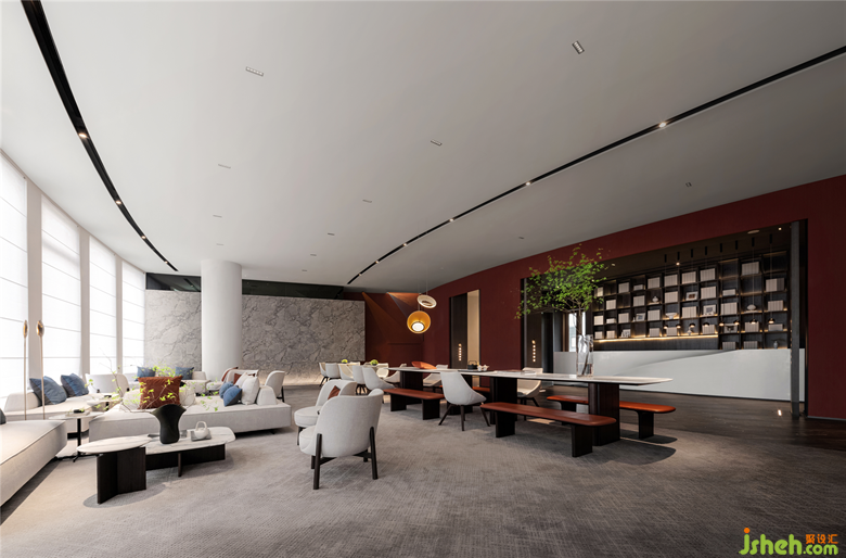 灰白塊面,于光影交織出一抹赭石紅,交疊高級灰墨,空間愉悅活潑、內(nèi)斂沉穩(wěn)。低矮時尚的茶歇雅座與自然花藝,讓洽談更自由。