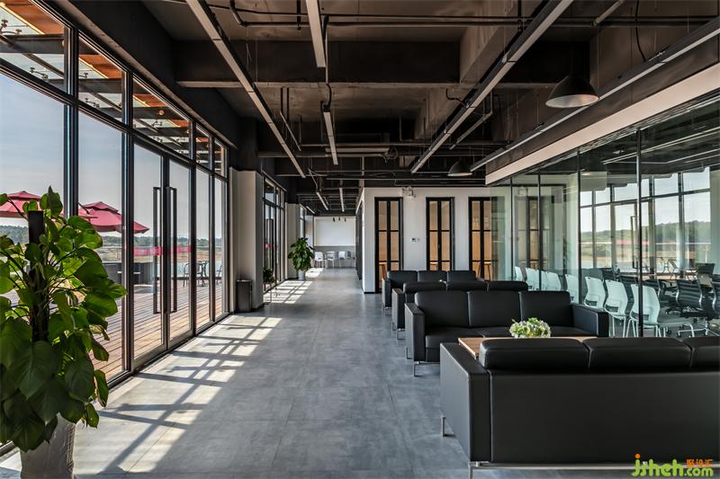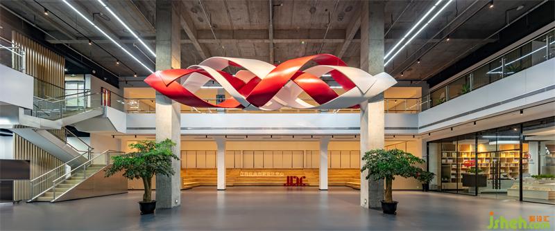 穿過展廳,空間重新置入創(chuàng)意社區(qū)及共享辦公的功能,對場地進行相應(yīng)設(shè)計,辦公室設(shè)計以激發(fā)場地的空間潛力,賦予它作為城市創(chuàng)意社區(qū)的新生。現(xiàn)代主義意蘊的紅白相間吊空裝置,凝固了最有張力的瞬間,提升了整個創(chuàng)意社區(qū)的藝術(shù)趣味。