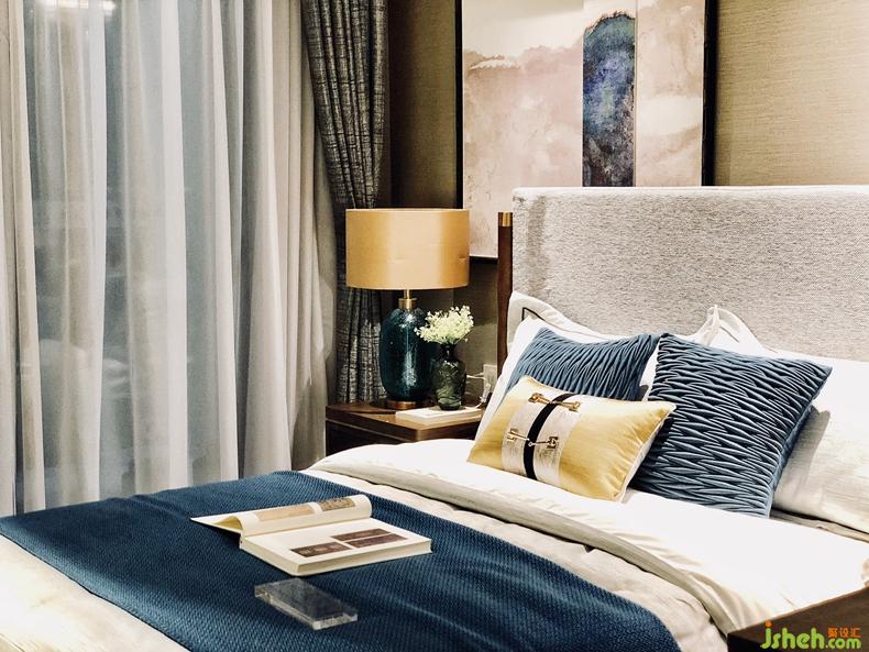 主人對生活的情致最能體現(xiàn)在每一個臥室中。斑駁的水面掛畫、深沉的藍色浪花紋路,布藝以及深灰的色彩搭配,都在告訴我們,居住者思想深沉而向往靜謐。