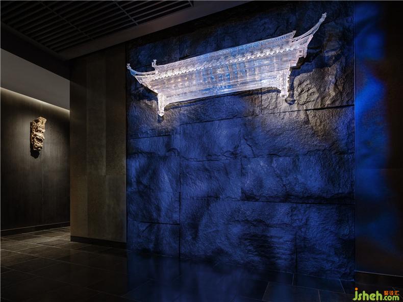 品粹1788前廳,晶瑩剔透的徽派門罩造型裝嵌于黑色蘑菇石墻上——通過(guò)樹(shù)脂玻璃鋼倒膜工藝制作,跳脫傳統(tǒng)徽派風(fēng)格內(nèi)飾慣用元素,打破前廳低調(diào)莊重的深沉基調(diào)。水晶般剔透的門罩材質(zhì)肌理在燈光下應(yīng)運(yùn)變幻,餐廳設(shè)計(jì)捕捉觀者進(jìn)入前廳的第一視覺(jué)落點(diǎn),成為空間的精神象征。