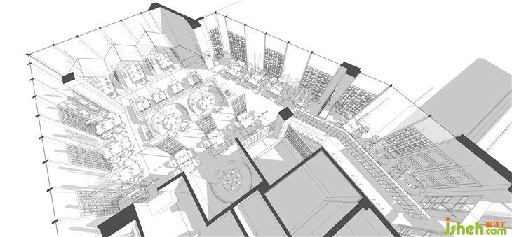 原圖建筑中間的核心筒處在整個餐廳最核心的中間位置。很尷尬的把空間均分為二。布局上利用廚房和吧臺吧畸形的角落空間利用起來?;銥檎R园膳_為紐帶,把廚房和就餐區(qū)的功能分開,把服務(wù)聯(lián)系在一起。