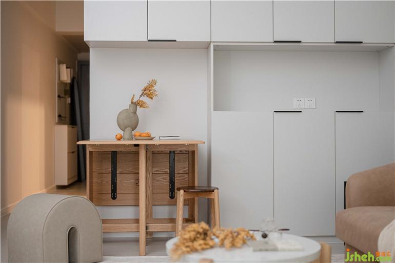 主人房也是跟客廳一樣,有一條梁柱在床的左側(cè),廣州舊改設(shè)計(jì)為了改善這個(gè)問題,我們做了一個(gè)半拱形,既不影響衣柜的位置,也不影響床的尺寸。再結(jié)合半圓的油畫掛飾和橢圓的床頭燈,讓硬裝的形態(tài)和軟裝的元素相呼應(yīng)。