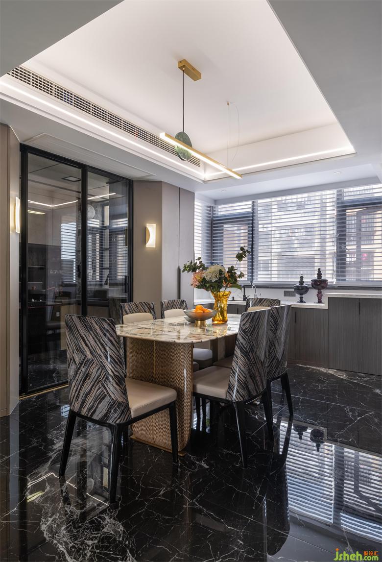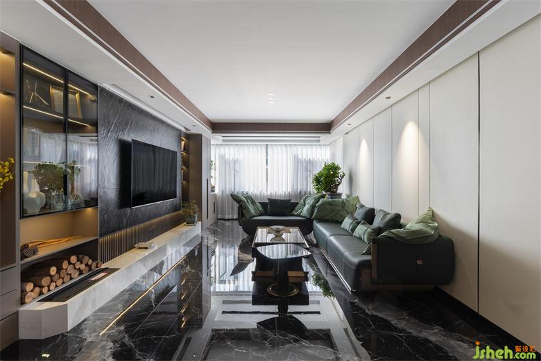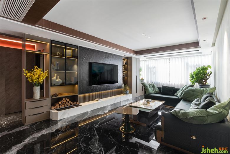 花園家居設(shè)計(jì)師巧妙利用柜子的展示和收納,再結(jié)合實(shí)木格柵、天然石皮的質(zhì)感,層次豐富的展示了會(huì)客廳的尊貴氣質(zhì)。并且大膽選用風(fēng)險(xiǎn)極高的黑色地磚,畫(huà)面輕重適當(dāng)、主次有序。室內(nèi)設(shè)計(jì)師