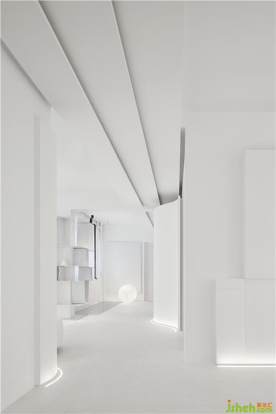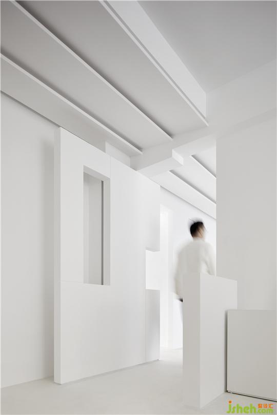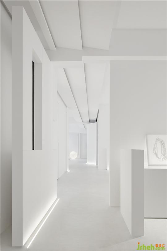 只在過道部分出現(xiàn)的吊頂,不僅隱藏了中央空調(diào),造型上,辦公室設(shè)計(jì)以三片式斜頂形式出現(xiàn),結(jié)合燈光,以加強(qiáng)灰空間的導(dǎo)向性。這種出現(xiàn)在空間頂面、貌似“道路”的形式,喻義一種指向,即通向“平和”、“寧靜”、“永恒”的心靈彼岸之路。