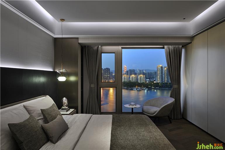 福州豪宅設(shè)計(jì)主臥延續(xù)輕奢基調(diào),以木質(zhì)墻板和金屬的碰撞營造空間的藝術(shù)感和精致感,并以不張揚(yáng)的色調(diào)打造靜謐、舒適的空間氛圍。