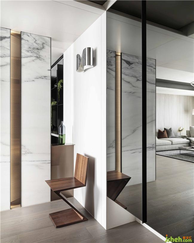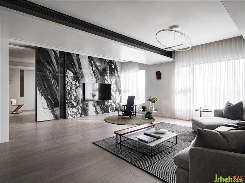 本案位于臺北,為二戶打通的新成屋。美麗的景美溪畔,對于這環(huán)境的喜愛讓屋主買了新家亦是選擇于一溪之隔建案。移除分戶墻將二個(gè)空間合而為一,一方面整合了窗戶,整面大面積開窗讓屋內(nèi)納入大量采光,戶外的風(fēng)景更是一覽無遺。設(shè)計(jì)經(jīng)由層層思考過后,將空間規(guī)劃二端為私領(lǐng)域空間,中間場域則為公領(lǐng)域空間,其目的在于每經(jīng)過一個(gè)空間都可以看到美麗的風(fēng)景,而經(jīng)過每一個(gè)轉(zhuǎn)折處就是質(zhì)感端景。男主人和女主人都喜歡簡潔調(diào)性,因此,在空間的設(shè)定上,以線條、幾何等元素組構(gòu)場域而成,而為了讓空間有重心及豐富的感受,以黑云石串起這視覺焦點(diǎn)。曲線蜿蜒的黑云石面,除了給人流動(dòng)的感受之外,亦和窗外的景美溪相互呼應(yīng),讓遠(yuǎn)方的山景似乎也納入空間場域形成山水意象,使人處于空間之中,如同身處大自然般的舒適愜意。裝修公司
