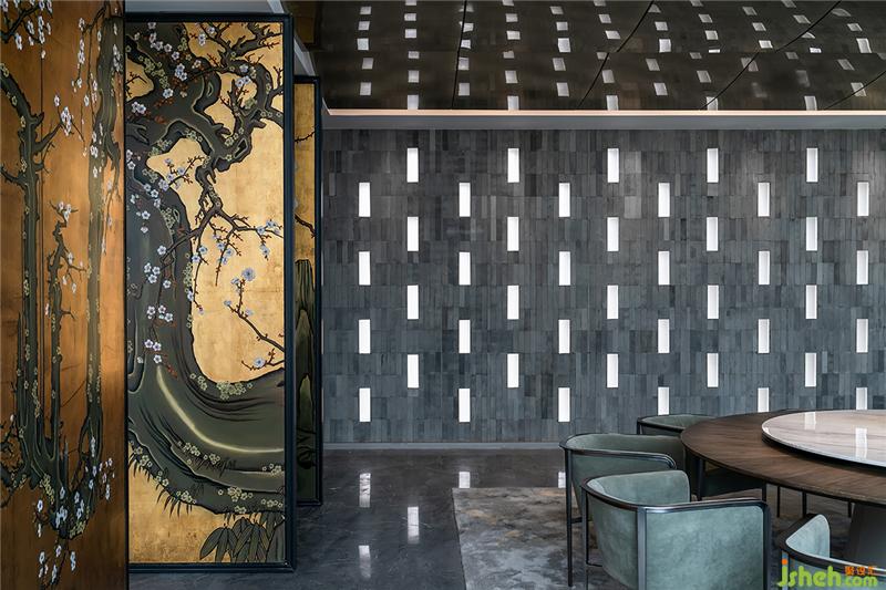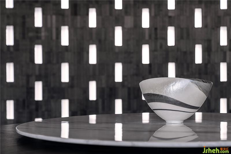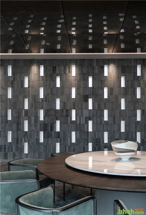 外立面鏤空的造型能讓光線進(jìn)到室內(nèi),如何引入光線也是思考的方向,磚的概念通過虛實(shí)的表達(dá)方式,青磚與玻璃磚的搭配,讓光有節(jié)制的穿透,營(yíng)造戲劇性的光影氛圍。這是建筑與室內(nèi)的一種交互,白天室外賦予室內(nèi)效果,晚上室內(nèi)賦予建筑光影。