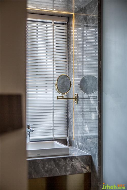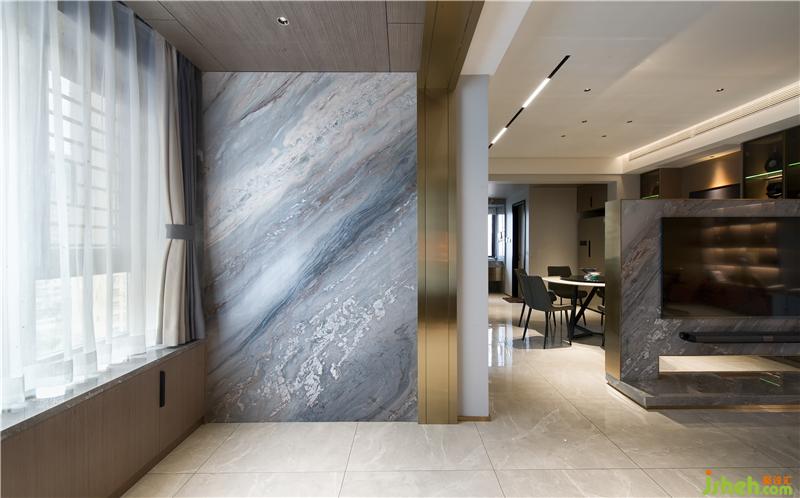 客廳是生活的中心,是一個萬能空間。它是一個公共空間,與私人空間是完全分開的。在設(shè)計時要考慮到業(yè)主的家庭成員、身份地位和他的社會關(guān)系。通過對家具的陳設(shè)來逐漸一個穩(wěn)定的空間,以滿足家庭對其空間的需要。地面使用灰色地磚托起一個舒適氛圍,天花采用平頂和線條進行分割,墻面及沙發(fā)背景運用到了藝術(shù)涂料和墻板相結(jié)合同時加上明暗色彩與造型的碰撞,打造出不一樣的視覺感。電視背景采用藍金沙大理石與金屬的結(jié)合彰顯奢華。