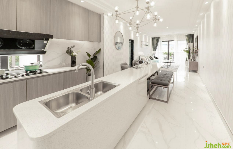 開放式空間設(shè)計,令書房、廚房、餐廳、客廳四區(qū)一體化,設(shè)計師靈活地利用空間布局,劃分各區(qū)的功能性作用,增加了儲物功能,使得空間看起來非常整潔干凈。而且整體米白色色調(diào)為鋪墊,金屬材質(zhì)點 綴,營造一種輕盈透亮的時尚感,不失個性,兼具品味與高貴。