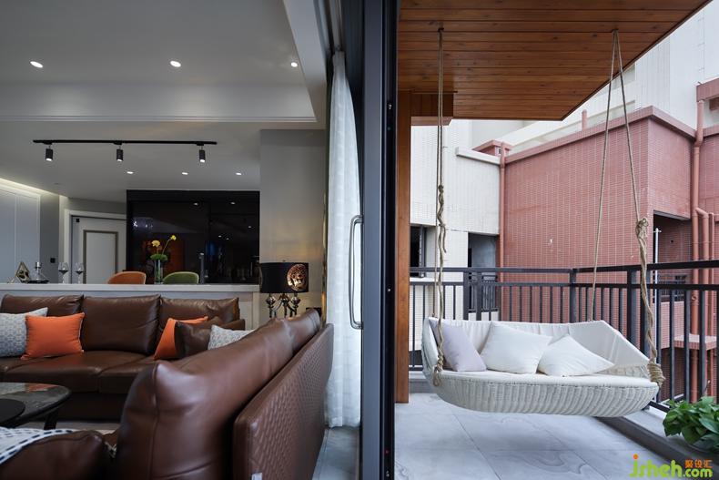 休閑陽臺天花及墻面采用防腐木裝飾,營造優(yōu)美的室內花園,搭配雙人搖椅。家,是用來釋放一天的壓力,舒心的地方。
