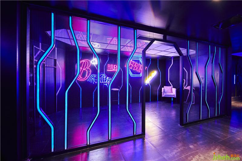 包廂區(qū)域設(shè)計(jì)師大面積地采用流行尖端的宇宙藍(lán)和太空白,運(yùn)用體塊疊加,與材料的有趣排列制造一種時(shí)空隧道的空間質(zhì)感,利用時(shí)間穿梭的設(shè)計(jì)概念、線條幾何圖形、環(huán)境燈光等設(shè)計(jì)元素將天花、墻面、地面有機(jī)結(jié)合,結(jié)合動(dòng)態(tài)光效,賦予空間極強(qiáng)的韻律感。