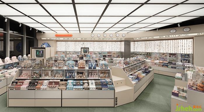 復(fù)古綠的水磨石地面與“實驗操控臺”元素的貨架設(shè)計相得益彰,局部不銹鋼拼貼停機坪地面造型,一同營造飛艇控制、制造室的空間氛圍。
