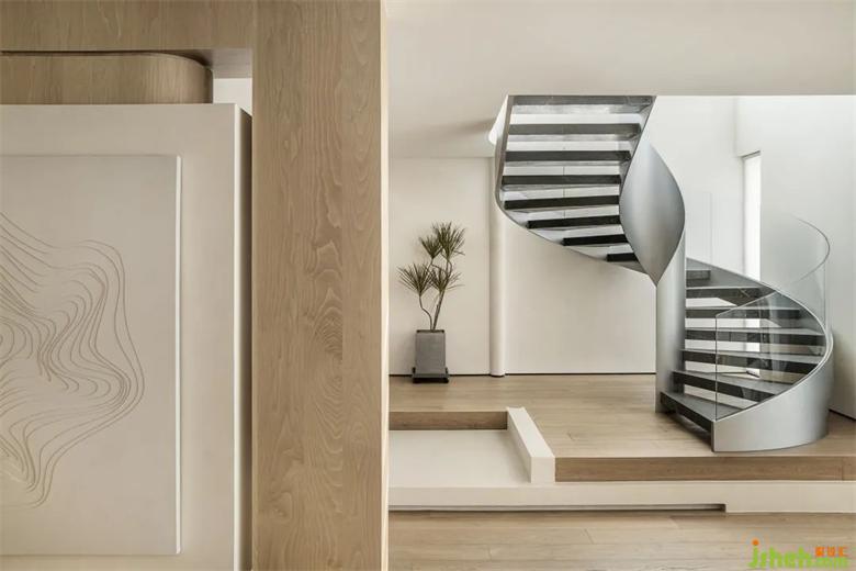 延伸質感與造型元素加入銀色不銹鋼,使空間趨于沉穩(wěn),窗外景致躍然入室,一種俊朗風度隨即而出。光影游走間虛實相生,秩序與無序并存,嚴謹與浪漫相輔,于無聲中生妙境,拾級而上,層層鋪陳,終會到達內心的理想國。
