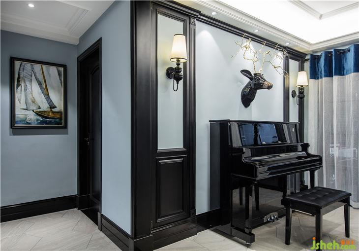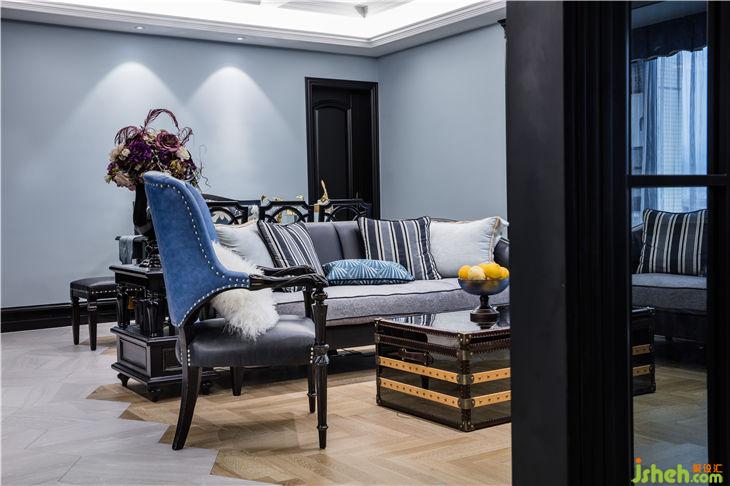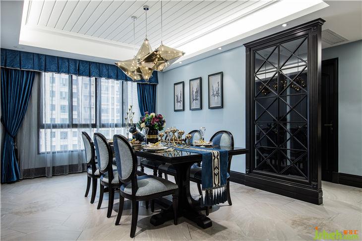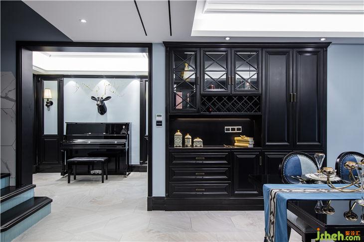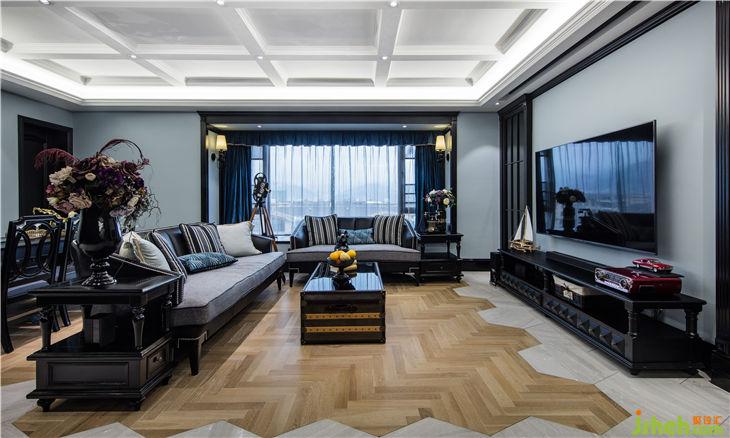 一間有窗的房子就像一間有風(fēng)景的家,而這個(gè)戶型客廳位置有著巨大的飄窗,外面的風(fēng)景被投射進(jìn)來(lái),投射在室內(nèi)的每一面墻上。先有距離,然后有了光,從窗戶影射進(jìn)來(lái)的陽(yáng)光打在人字拼的木地板上,讓這個(gè)暗黑風(fēng)格的室內(nèi)環(huán)境充滿一絲絲溫潤(rùn)。萊茵藍(lán)的墻面漆與黑色的木飾面,人字拼的木地板與平行的六角磚相結(jié)合不僅打破固有的氛圍,光線通過折射迅速充盈整個(gè)空間形成鮮明的對(duì)比。