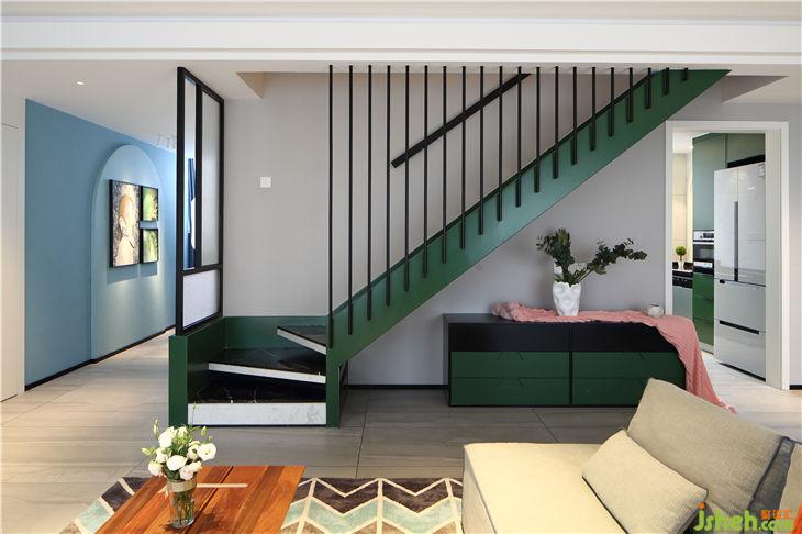 墨綠色鋼結(jié)構(gòu)的樓梯采用鏤空設(shè)計(jì),外掛的欄桿讓原結(jié)構(gòu)只有700mm的樓梯不顯得擁擠。