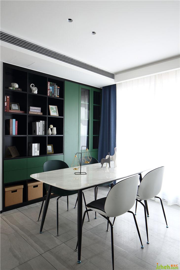業(yè)主作為85后的年輕父母,依然童心未眠,喜歡色彩艷麗的北歐。最終選取了墨綠色作為主體色調(diào)。設(shè)計(jì)師采用灰色和黑色進(jìn)行了調(diào)和,讓綠色在居住空間中更顯得溫潤(rùn)地得以呈現(xiàn)。