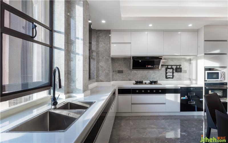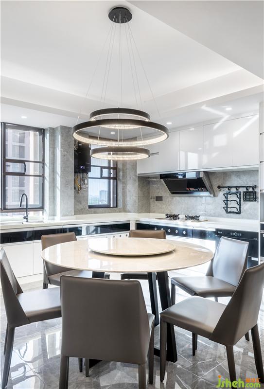 公共空間采用客餐廚開放格局規(guī)劃,開放式廚房采用黑白雙色設(shè)計(jì),與全屋黑色電器互相交映,提升整體視覺效果質(zhì)感。同時(shí)開放式廚房不僅提供充足的存儲(chǔ)空間和座位,而且不會(huì)分散主要社交中心的注意力。