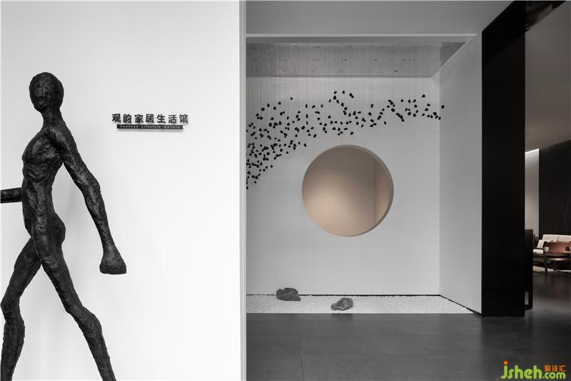 從前廳進(jìn)入玄關(guān),造景與造境,無數(shù)黑色石子從天而降,回歸于一圓盤,寓意“萬物歸一”,順著動(dòng)線的引導(dǎo),進(jìn)入產(chǎn)品體驗(yàn)空間后,體驗(yàn)者藉由移動(dòng)、視野、猜想,與空間產(chǎn)生互動(dòng)能量。重新以美學(xué)的展現(xiàn)存在于空間序列之中,構(gòu)建起純粹且順應(yīng)建筑優(yōu)勢(shì)的室內(nèi)空間邏輯。