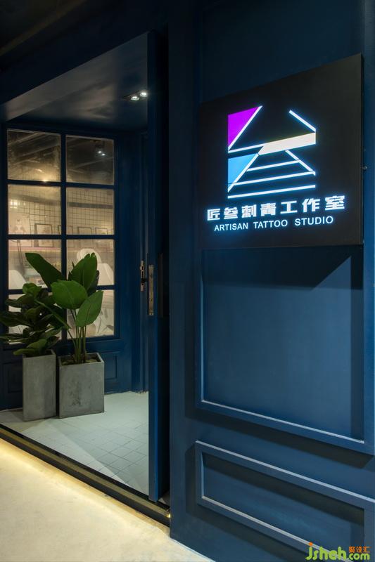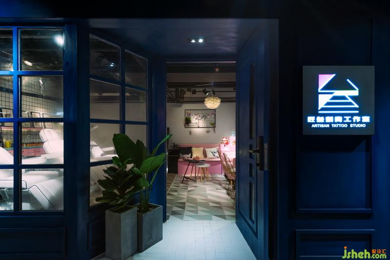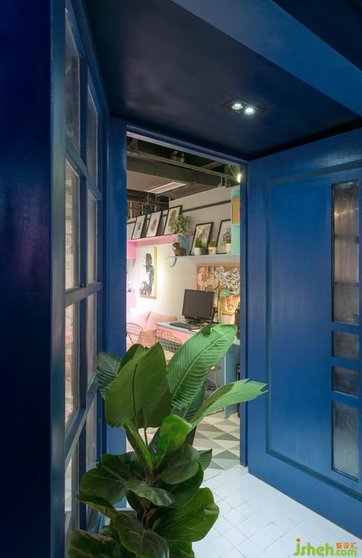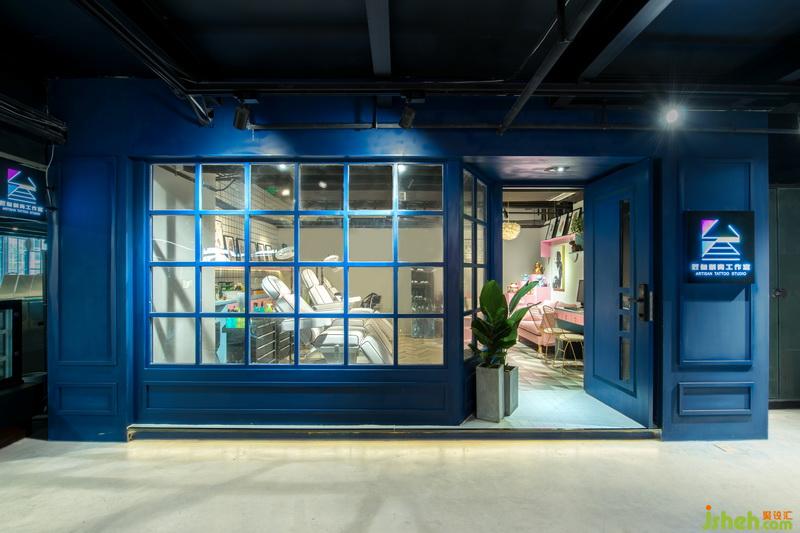 靜謐藍(lán)的大面積使用給整個工作室的外觀增添了沉穩(wěn),神秘的感覺。玻璃窗的應(yīng)用使得店面里的場景清晰明了,更大程度的吸引路人的目光。室內(nèi)設(shè)計師