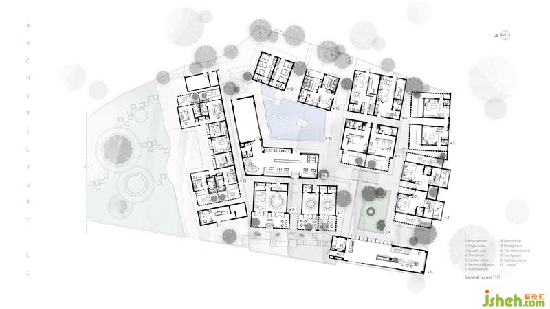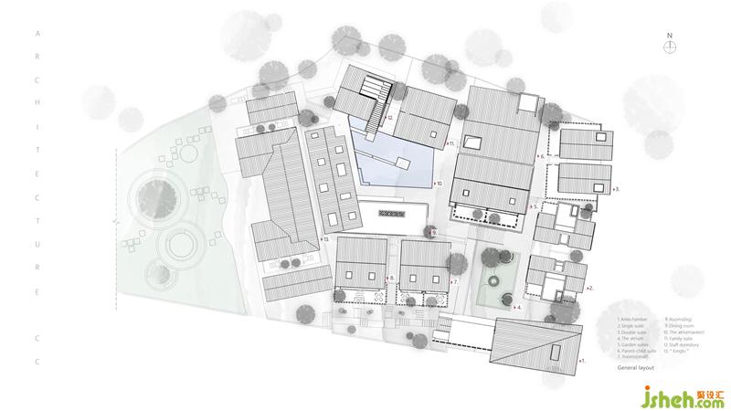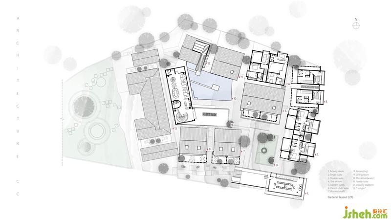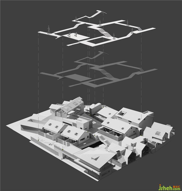 Since the original building site is strewn at random in height, forming a natural and rhythmic skyline, this design retains the irregular style of the original site to the greatest extent and adopts the multi-level generatrix design for achieving the elevation difference of the building structure; In order to enrich the view of the main landscape, we use the design of ramps and stairs to form multiple circulation generatrix.