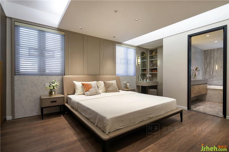 沿襲柔和時(shí)尚的空間色調(diào),主臥以灰咖+白色打造輕奢質(zhì)感。室內(nèi)設(shè)計(jì)師