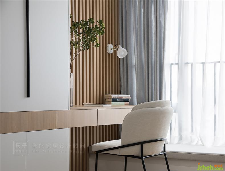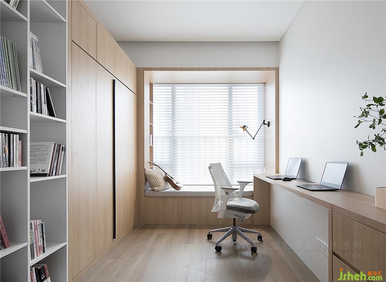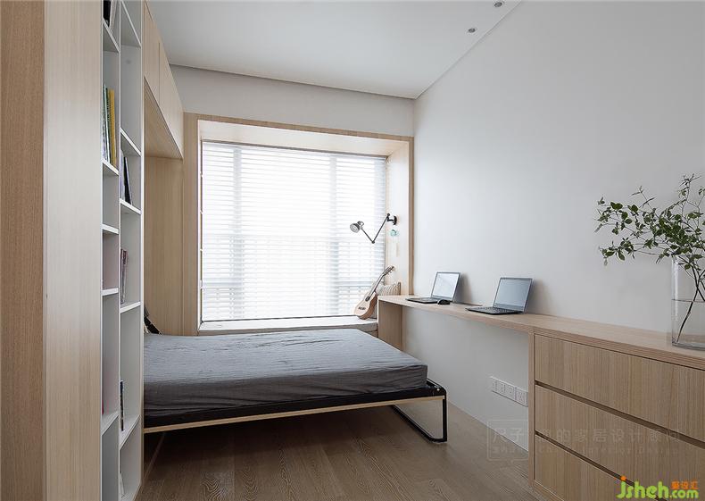 打破千篇一律的固化印象,地臺(tái)形式的主臥傳遞更自由的生活狀態(tài);衣柜與書(shū)柜結(jié)合,上下錯(cuò)位的柜門(mén)拉手增加時(shí)尚造型感。