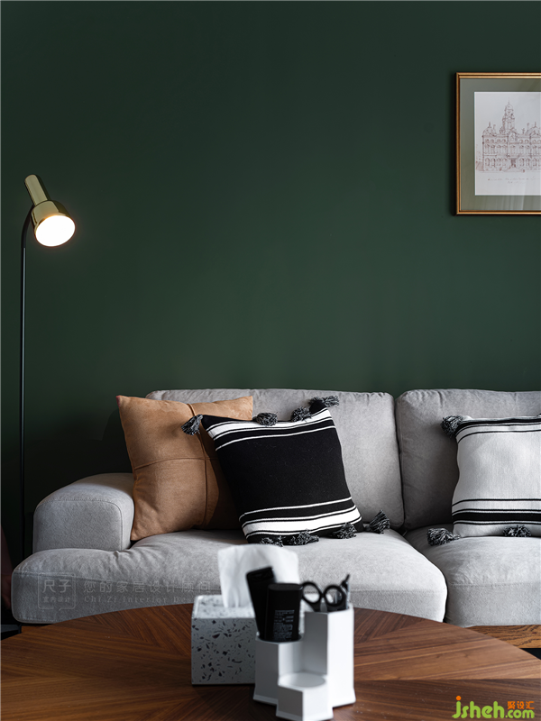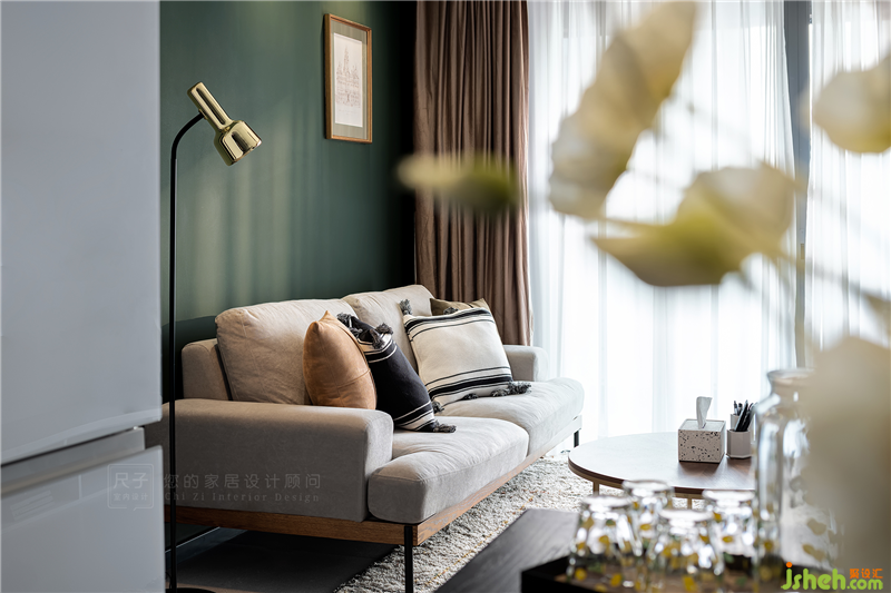橄欖綠由入門處一路延伸至此,搭配上淺色調(diào)的沙發(fā)地毯,加之咖色窗簾,以及淺金色的小面積點(diǎn)綴,整個(gè)空間簡(jiǎn)約卻充滿層次感。