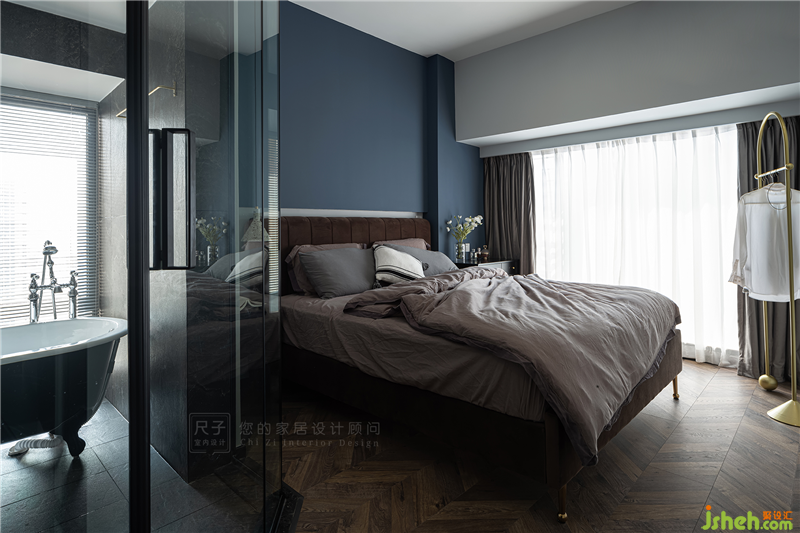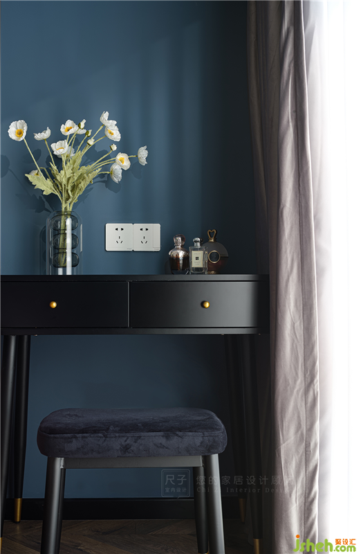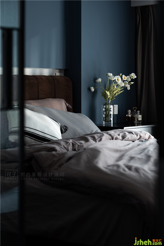 室內(nèi)設(shè)計(jì)師將主臥延續(xù)了整體的復(fù)古風(fēng),靜謐的海軍藍(lán)床頭背景像是這里的主角,高雅柔和的咖啡色絲絨床則自帶高級(jí)感,一同將空間裝飾得優(yōu)雅又慵懶。