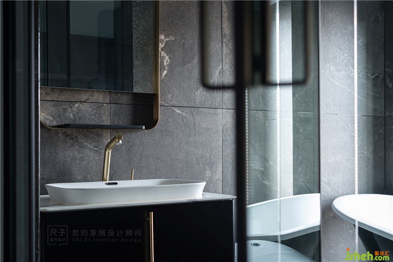 與睡眠區(qū)以一扇玻璃門相隔的衛(wèi)生間,是高級(jí)感滿滿的黑白時(shí)尚,金色配件的點(diǎn)綴則為空間增添了精致輕奢的韻味。