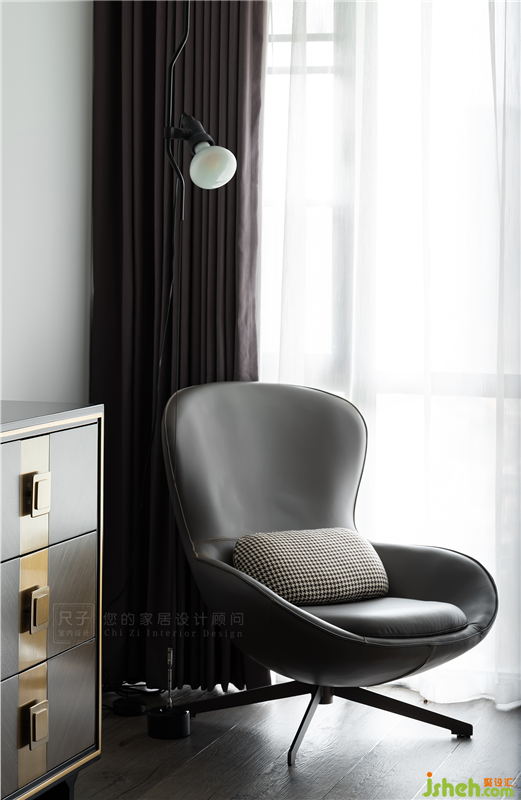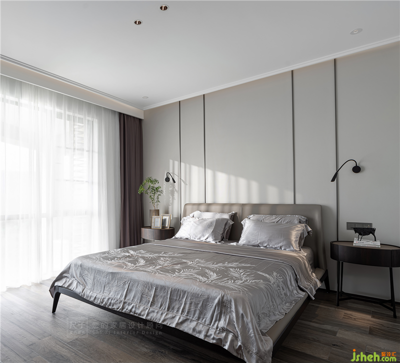 主臥簡約而溫柔。白色床頭墻,暖木色地板,兩側(cè)對稱的床頭柜與壁燈,現(xiàn)代優(yōu)雅的皮藝床鋪,呈現(xiàn)出輕松舒適的睡眠區(qū)。極少的色彩裝飾下,只是簡潔的白色和木色卻給我們一種舒緩與自然的純凈感。