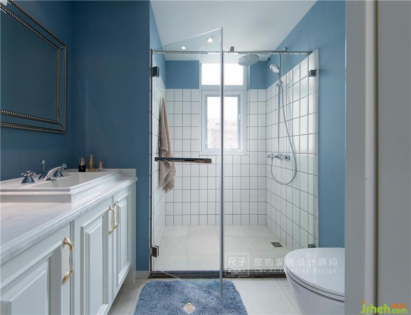 套間內(nèi)的洗漱空間是清新時尚的藍白配色,干凈、明朗,足以洗去一天的疲累。