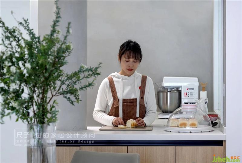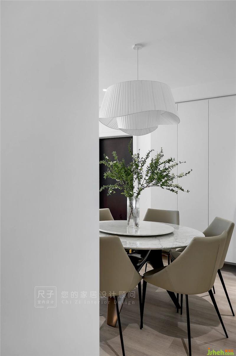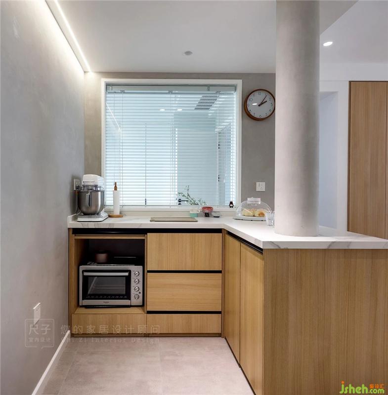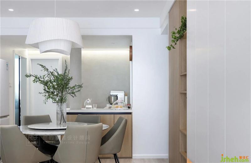 餐廳區(qū)域有一方不可改動的承重柱,尺子室內(nèi)設(shè)計以藝術(shù)涂料裝飾,巧妙地與西廚區(qū)墻面相呼應(yīng);環(huán)繞承重柱做的半高吧臺,也恰好讓兩個功能區(qū)有了隱隱的分割。
