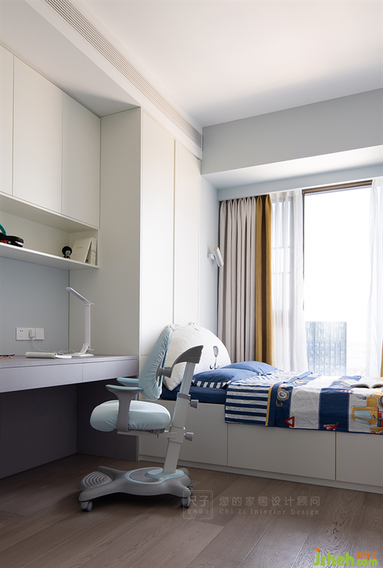 男孩房簡單大方,功能齊全,卡通玩具的布置,賦予空間生動活潑的特質。