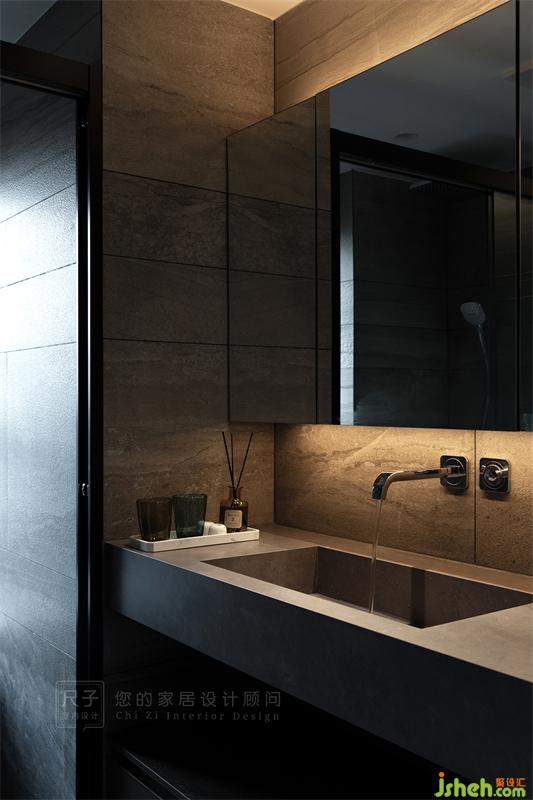 衛(wèi)生間是深色的調子,砂巖質感的瓷磚表面呈沙粒狀,與平滑的巖板臺面對比強烈,讓空間立體感更為突出。