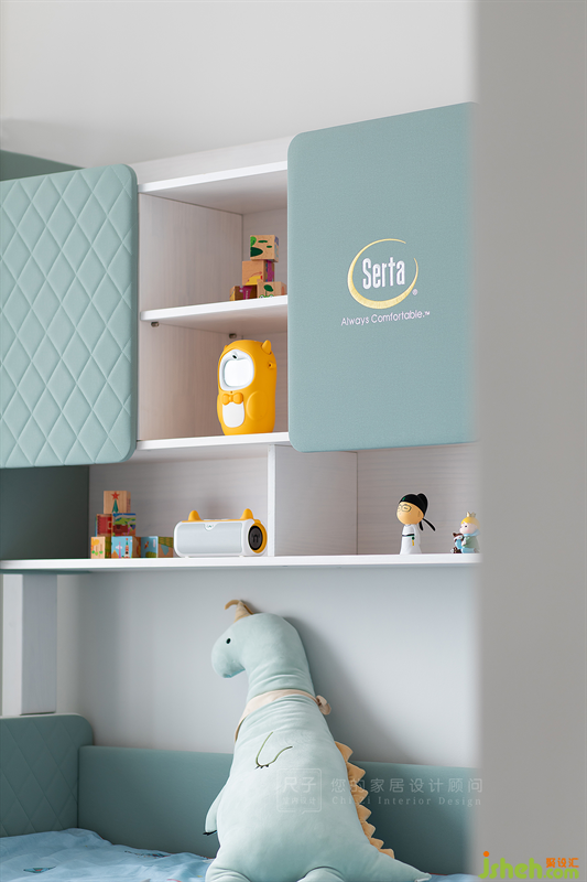 孩子們的房間更強調成長性和功能性,將原本的衛(wèi)生間拆除以擴大男孩房的面積,在這里開辟出一塊屬于孩子們的空間,增加了投影,方便姐弟倆在此一同玩耍或是上網(wǎng)課。