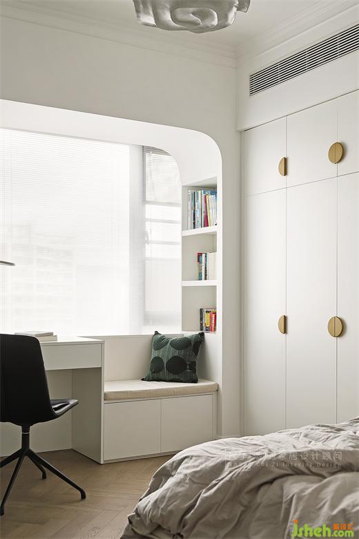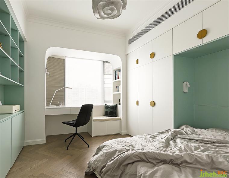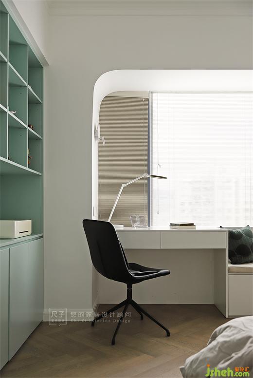 馬卡龍綠與白色散發(fā)著夢幻的氣息,陽光透過百葉窗滲入,整個空間靈動又夢幻,打造屬于孩子的私密場域。