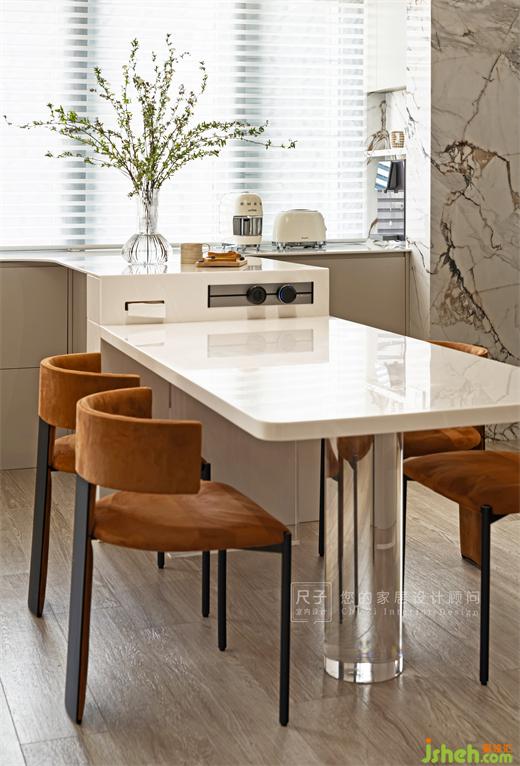 餐廳屬于橙色的那份美麗瞬間擴(kuò)散,巖板將優(yōu)雅大氣展現(xiàn)得淋漓盡致,百葉窗濾過的陽光形成的粼粼光斑讓用餐區(qū)顯得更有魅力,將溫馨值拉滿。