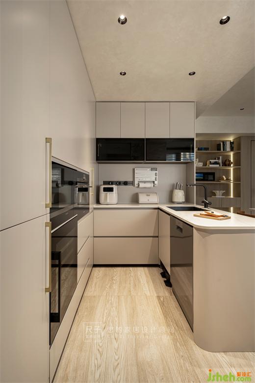西廚和餐廳中間利用島臺(tái)進(jìn)行了分隔,裝修設(shè)計(jì)不經(jīng)意間成為了一體化的界線,又彼此交融,加強(qiáng)了空間的流通性。電器與柜體結(jié)合的形式整個(gè)空間整體統(tǒng)一,U型布局儲(chǔ)物功能強(qiáng)大。