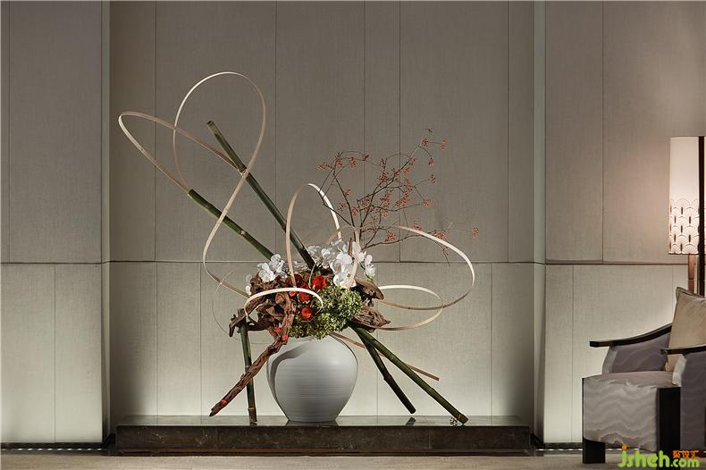 從洽談區(qū)穿過長廊來到VIP室,自忖幾許雍容與華貴的古典綠散發(fā)著神秘深沉的力量,猶如探尋無人涉足的森林深處,而VIP室的《草月流·花道》便像是這森林里的瑰寶,打破古典花道在材料、容器表現(xiàn)的空間的舊有框架,展現(xiàn)自由、與現(xiàn)代生活相適應(yīng)的多樣風(fēng)格。