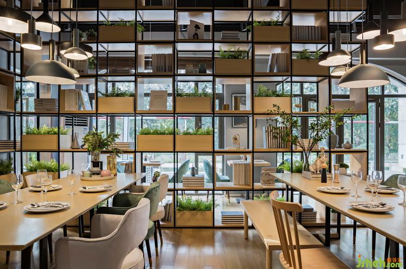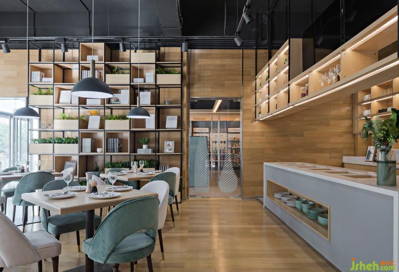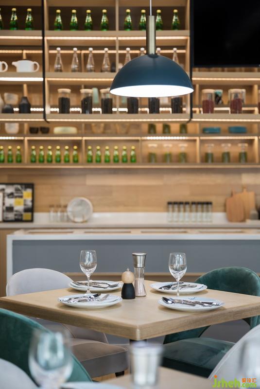 室內(nèi)設(shè)計(jì)師運(yùn)用大面積的原木色烘托一種舒適溫馨的氛圍,餐桌延續(xù)餐廳的主題基調(diào)原木色,而餐椅則分別選擇象牙白和玉簪綠進(jìn)行搭配,使得整個(gè)空間看起來更加愜意。在燈飾上選擇顯色性較強(qiáng)的白熾光源,溫暖明亮的光線亦可以為餐廳增添一抹別樣色彩。
