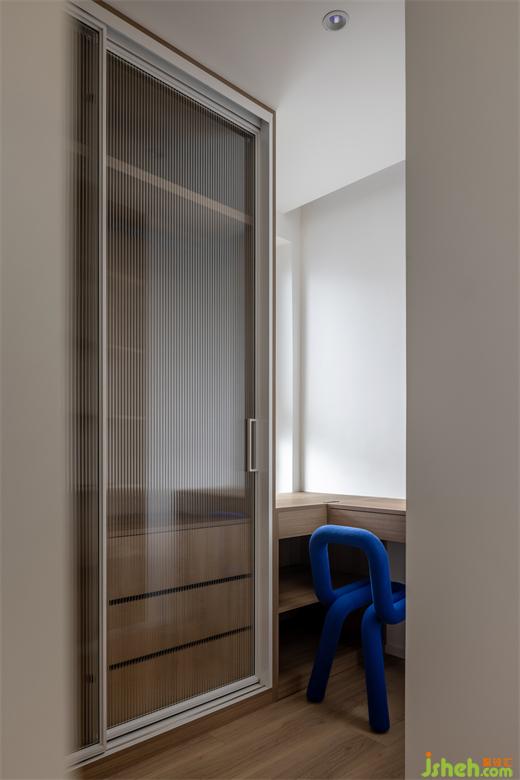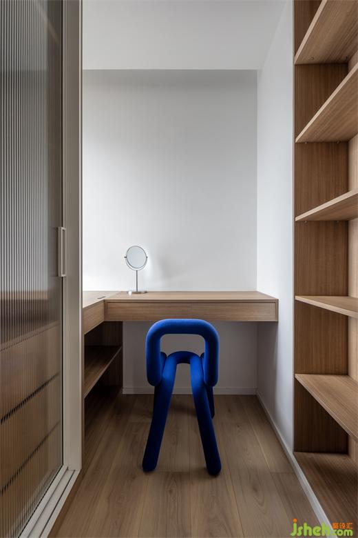 在衣帽間內(nèi)設(shè)置獨(dú)立的化妝臺,相對獨(dú)立的空間可以讓家居生活變得更為愜意。藍(lán)色的梳妝椅搭配木質(zhì)桌面給人以色彩的沖擊,天津天霖園裝修設(shè)計(jì)整體造型簡潔優(yōu)雅、干凈利落兼具現(xiàn)代美感,展現(xiàn)優(yōu)雅愜意的品質(zhì)生活。