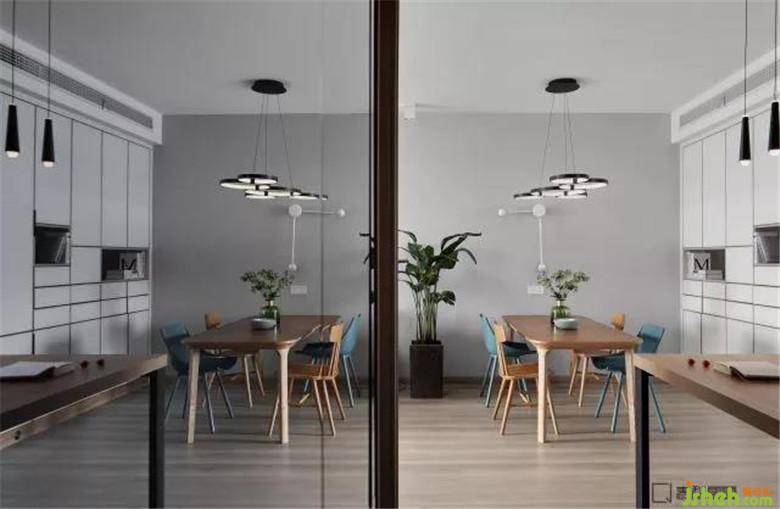排列有序的吊頂和那懸于天地間的吊燈給人以厚重的踏實感。藍色的椅子整齊擱置在淡黃色的桌子前面,室內設計師再配上清新的花束,形成視覺上的美感。