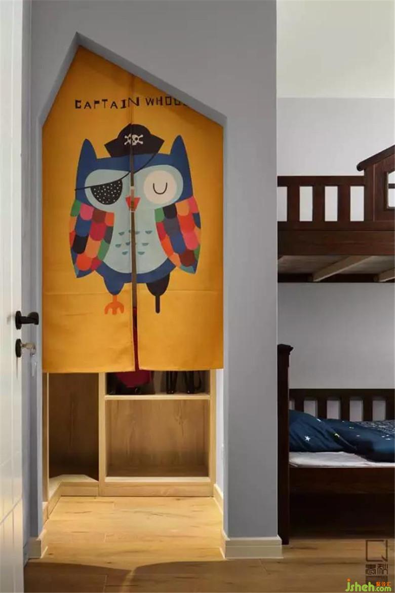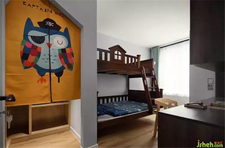 可愛的貓頭鷹,守護著兩個寶貝讓他們香甜入夢。上下鋪的設(shè)計不僅節(jié)省了空間,更具溫情。