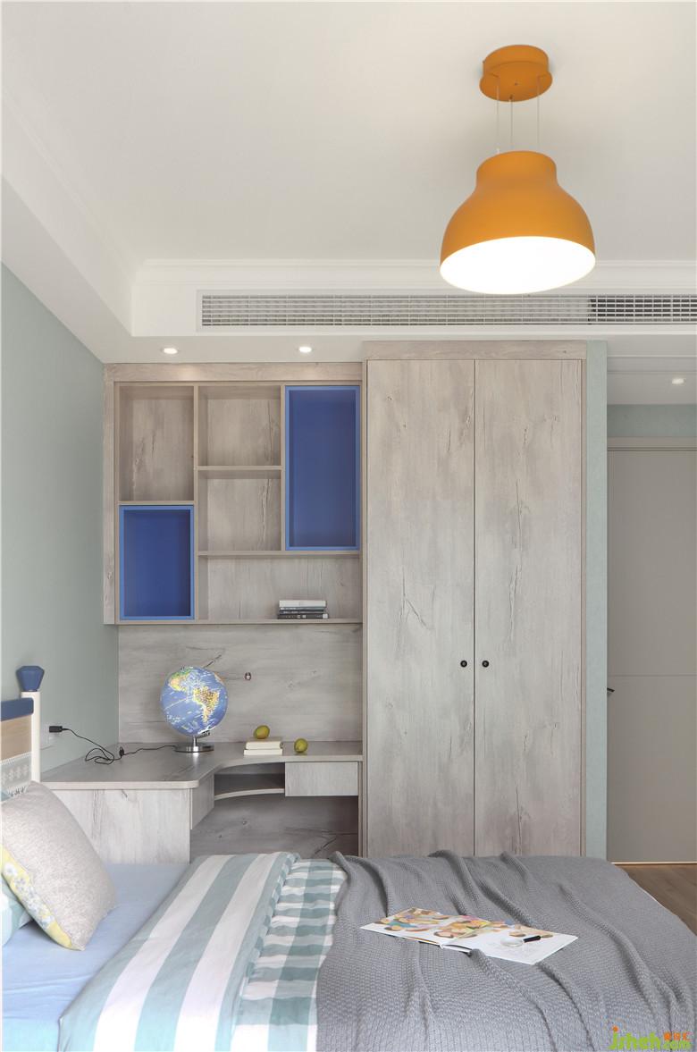 室內(nèi)設(shè)計(jì)師設(shè)計(jì)的灰白帶有星球壁畫的墻面,在點(diǎn)點(diǎn)藍(lán)色家具的映襯下,讓人仿佛徜徉在浩瀚宇宙,充滿了對未知世界的遐思。
