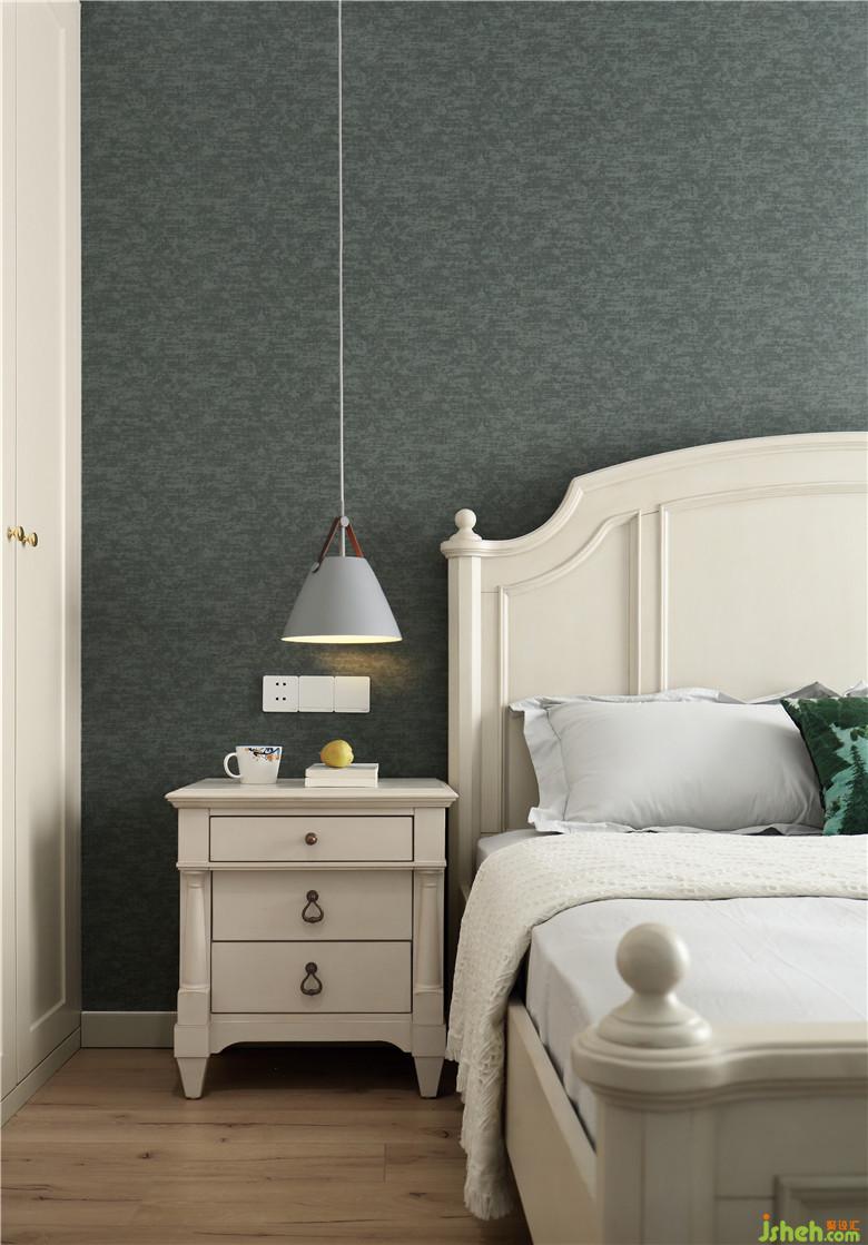 臥室墻紙室內(nèi)設(shè)計(jì)師選用了灰綠色,而家具則以白色銜接,并與地板的木色形成柔和的過渡,讓整個(gè)畫面融洽起來,帶來一種經(jīng)歷生活洗禮的溫暖氛圍。