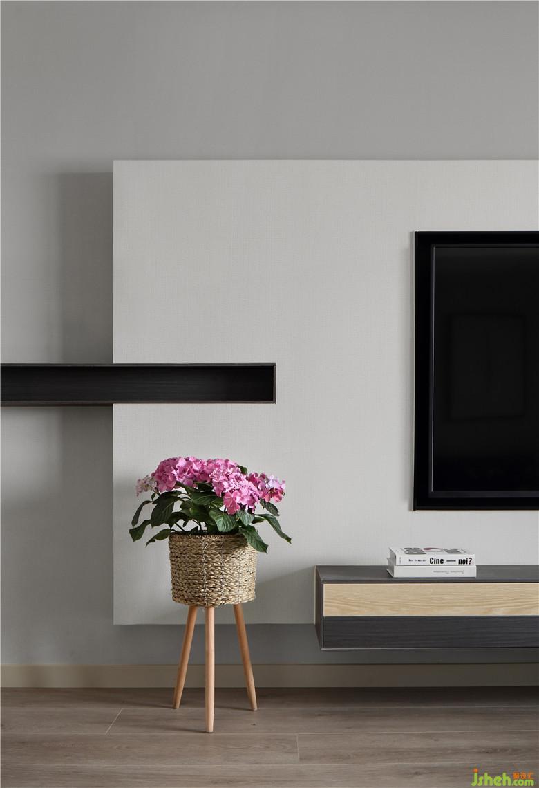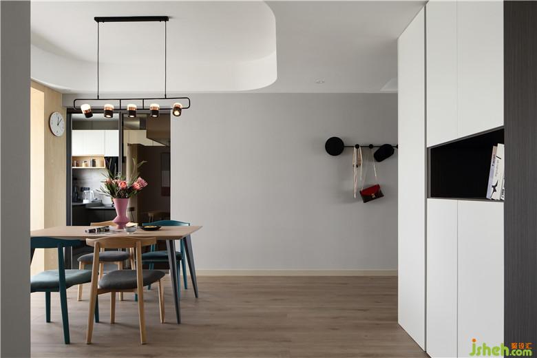 進門左手邊的一條小暗格,與客廳的電視機色系一致,遙相呼應,放些小裝飾品、鑰匙、小擺件,平時常用的小東西有了溫馨的小家,不顯凌亂。進門右手邊設計了一個掛圍巾和包的掛鉤墻面,即走即用,拿取方便。